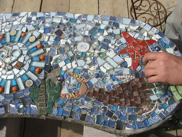 British sculptor and mosaic artist who transforms discarded materials like broken glass and ceramics into large-scale sculptural works, embracing recycling and reuse in art practice.